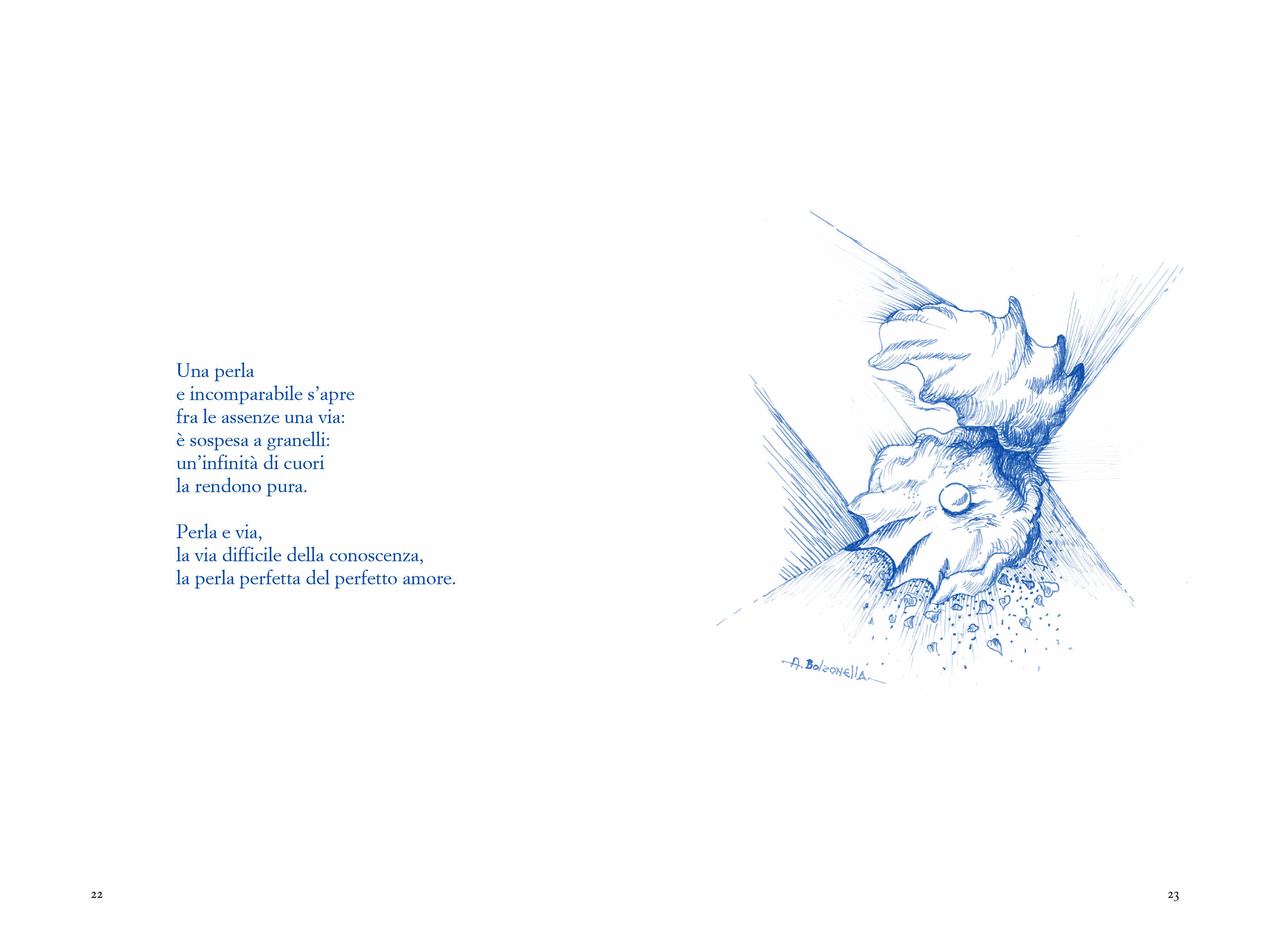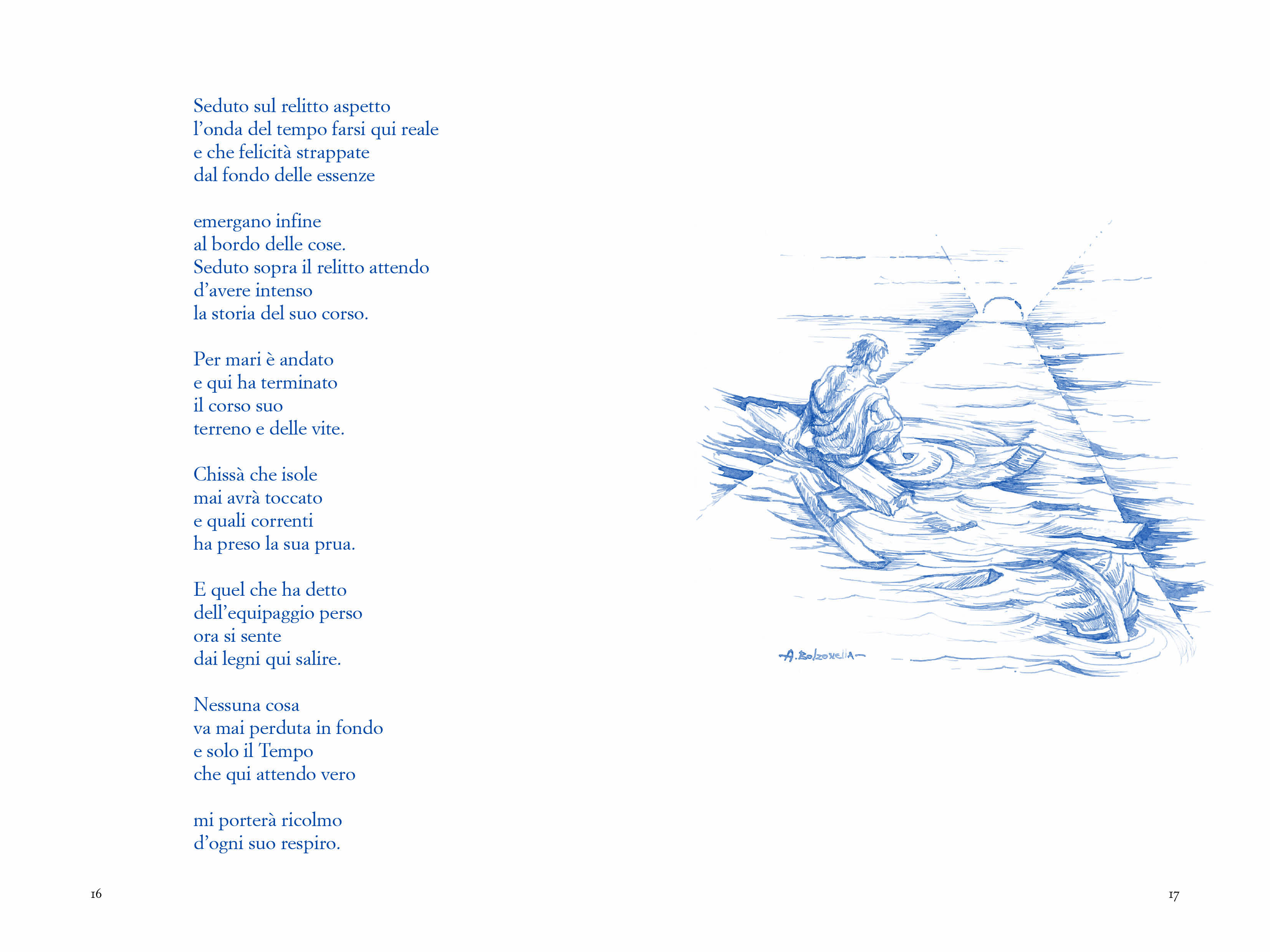 Lungo la via non mancano i relitti, siano essi oggetti apparentemente inanimati, tronchi spezzati distesi sulla spiaggia d’inverno, oppure persone, che hanno perduto l’orientamento e non trovano più la “via” verso casa, perché trafitti dalla vita, dal dolore, dalla mancanza, dalle malattie, dagli errori, dalle ingiustizie, dal vuoto. E nessuno di solito li considera, nemmeno li guarda e non si ferma per dare aiuto: “Nessuno si cura dei relitti/ che nella marina stanno/coperti d’alghe e di conchiglie. / Nessuno si cura mai di chi/ cade lungo la via del giorno/ e lì lo lascia senza guardare”. Ma i relitti sono ancora vita e da essi può scaturire una inimmaginabile energia: basta ri-abilitare il loro ed il nostro cuore per “vedere”, oltre le bassezze delle cose e far scorrere l’infinito in esse e su di noi. Infinito che è sempre presente nell’anima del mondo. Perché il relitto sa che “la bellezza d’anima non ruìna” e gli “immoti” possono riprendere vita: “Oh splendido mareggiare/ che porti qui dagli infiniti/ la prova d’ogni perfetto amore.” E il cammino nella via è ricco di impronte, di orme che cercano la Verità: “I relitti, anime foglia, passaggi d’anima”.